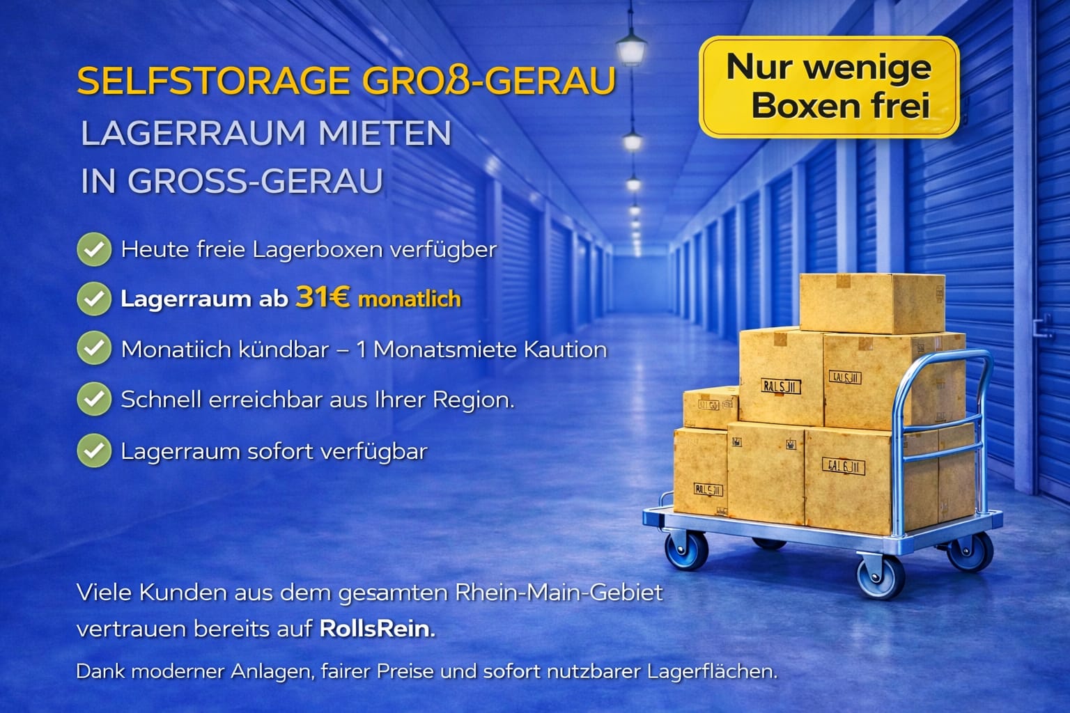 Sie suchen einen Lagerraum in Groß-Gerau? Unser Selfstorage Groß-Gerau bietet flexible, sichere und sofort verfügbare Lagerräume für Privatpersonen, Unternehmen und professionelle Lagerraum Mieter im Kreis Groß-Gerau und im gesamten Rhein-Main-Gebiet.